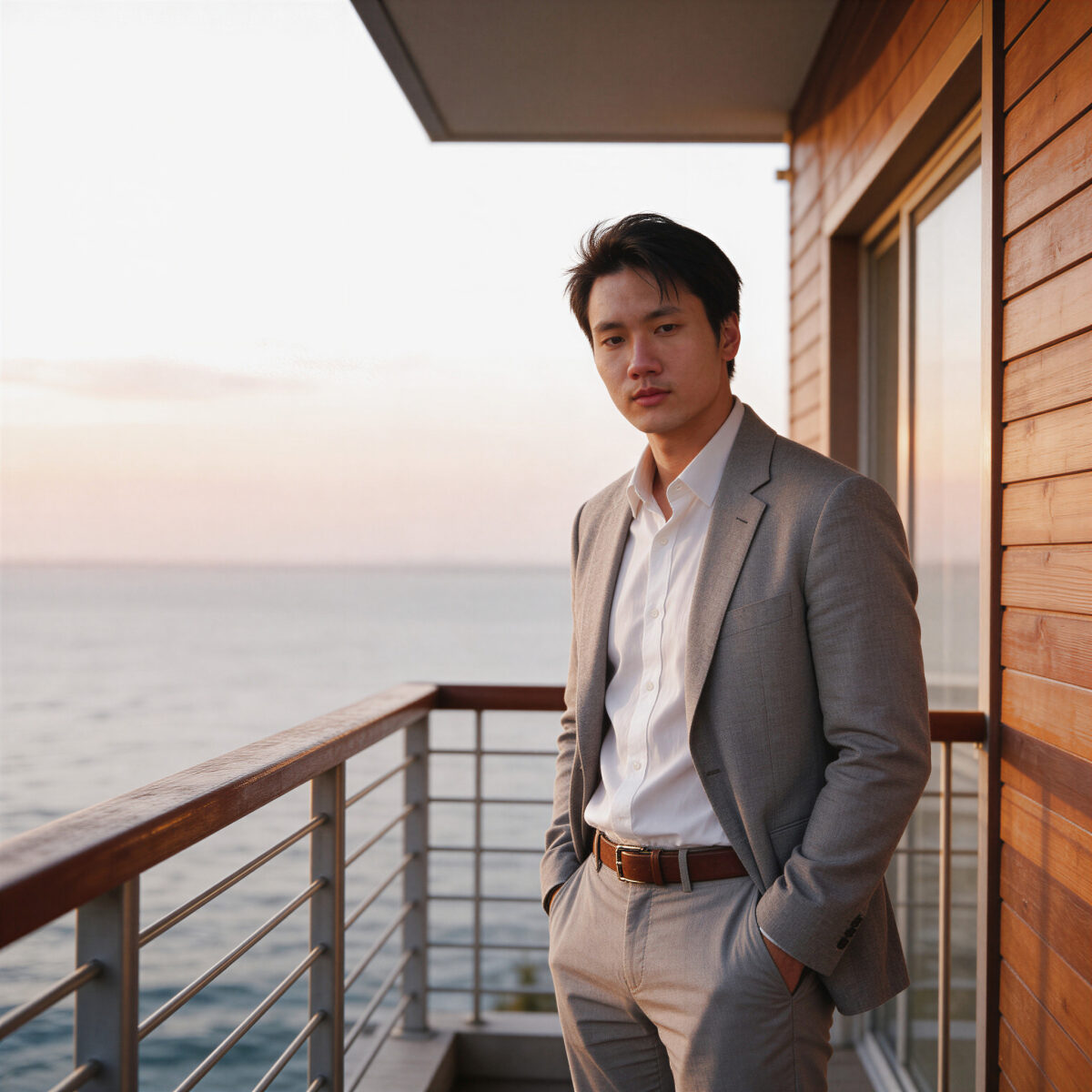 Man in a suit on a balcony at sunset, looking confident and stylish