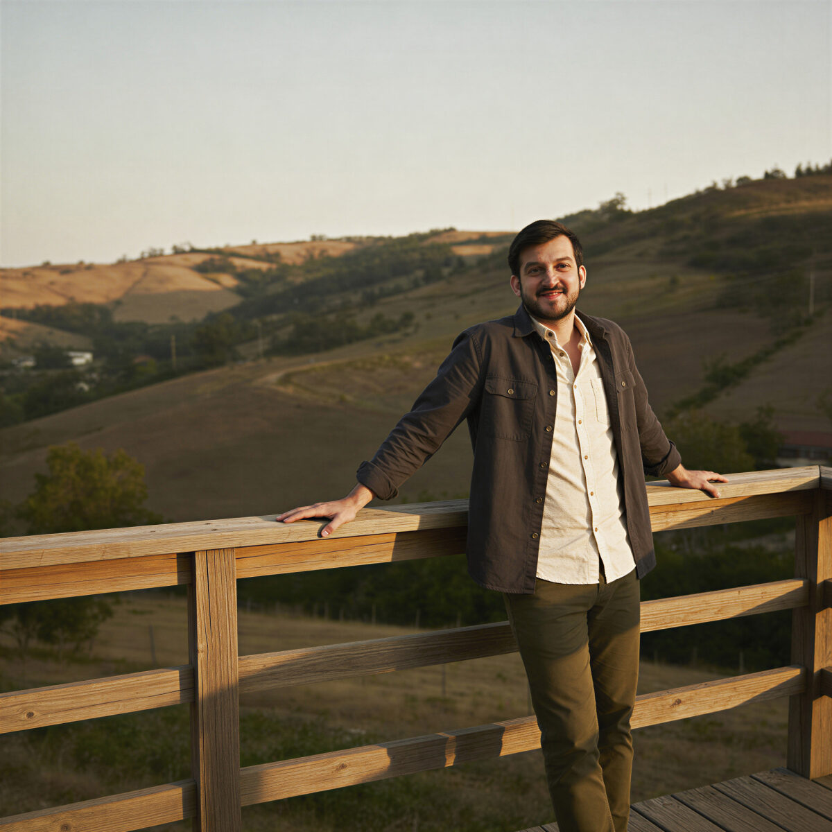 Man smiling, leaning on a wooden railing with scenic hills behind him at sunset