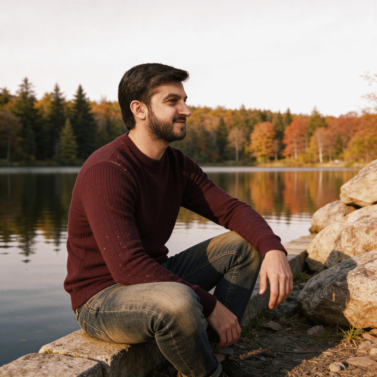 Man in sweater sitting by a lake with autumn trees in the background