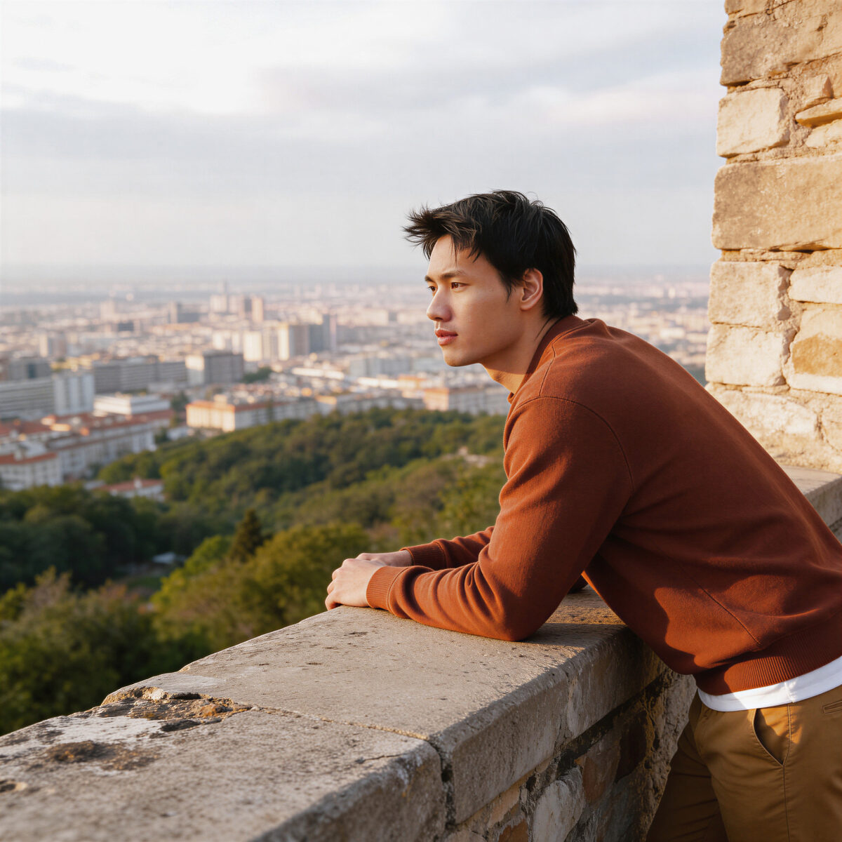 Man in brown sweater leaning on stone wall overlooking cityscape at sunset