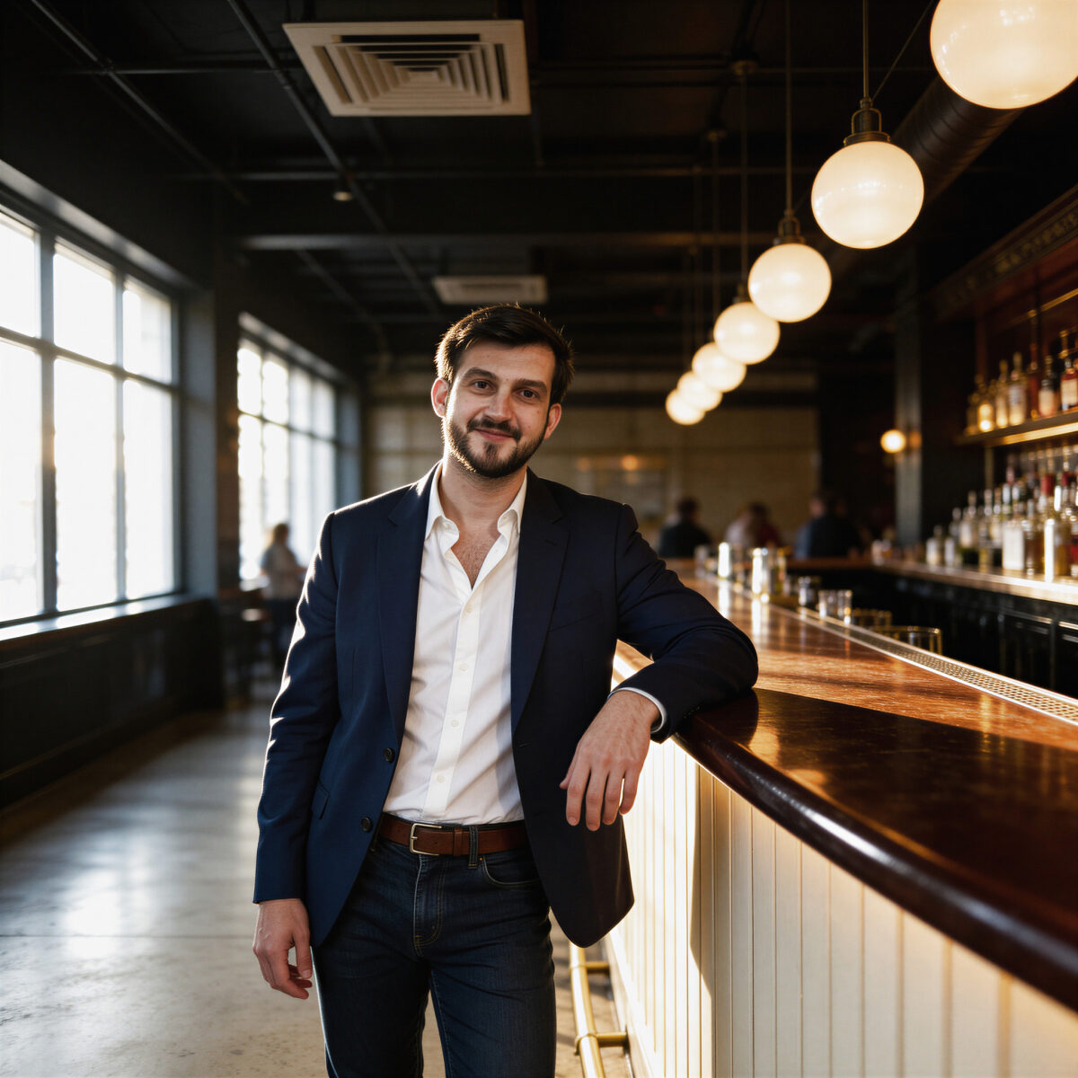Man in navy blazer and white shirt smiling at upscale bar, stylish dating profile picture