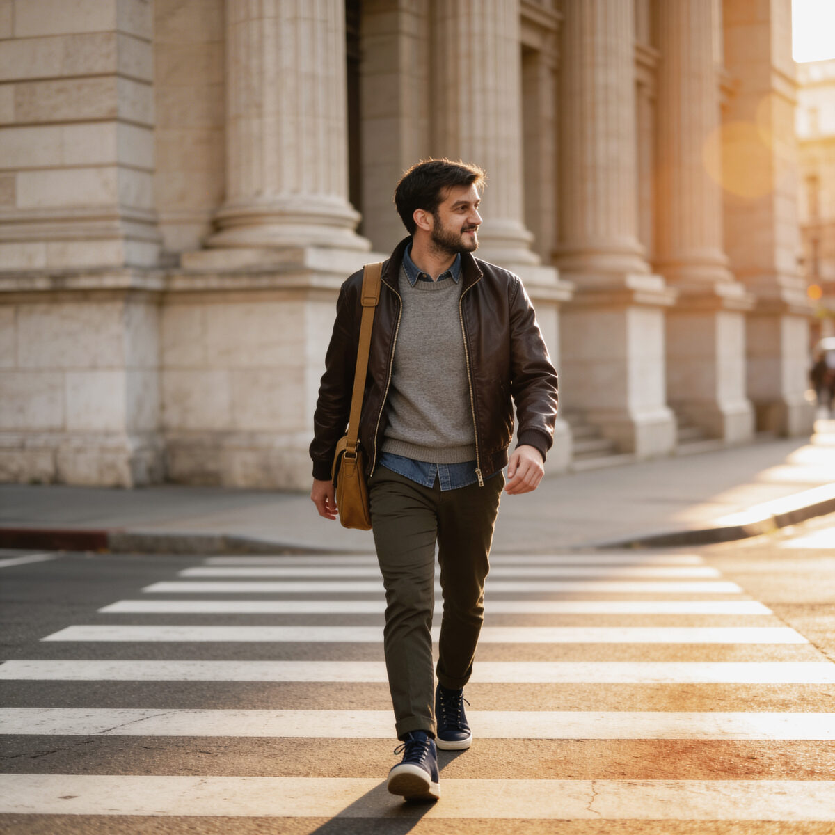 Man walking confidently across a city crosswalk in stylish casual outfit