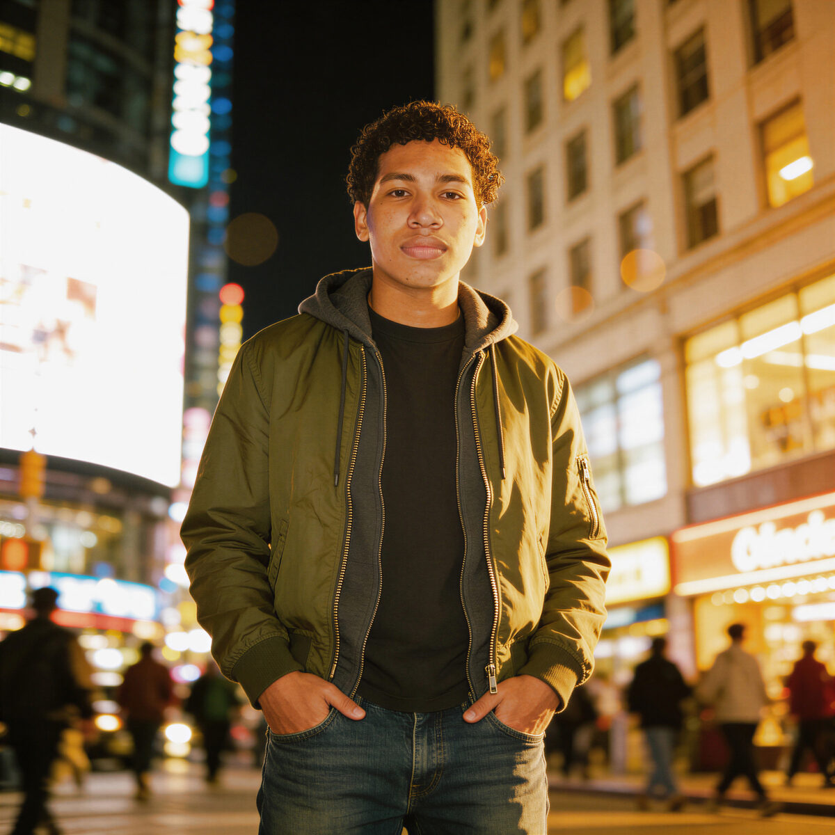 Man in casual jacket standing confidently on a city street at night with bright lights